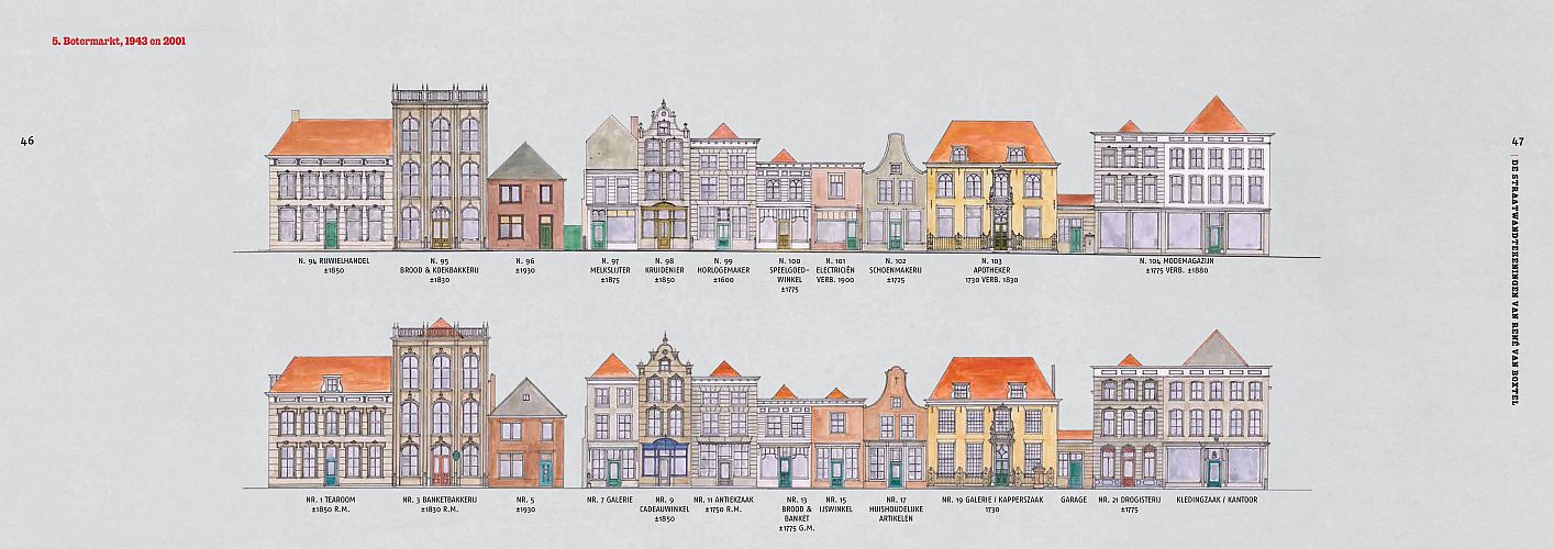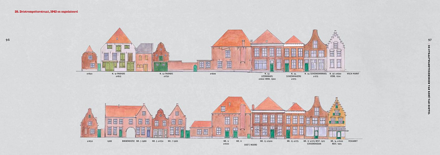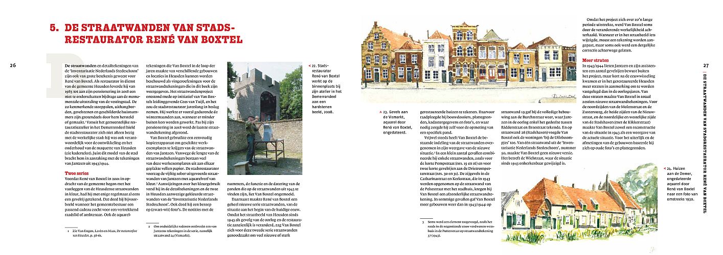 In de Tweede Wereldoorlog ontstond het plan om alle monumenten in de historische binnensteden in Nederland nauwkeurig op te meten en in beeld te brengen. Deze ‘Inventarisatie Nederlands Stedeschoon’ zou uiteindelijk slechts in een handjevol plaatsen worden gerealiseerd. Daaronder was Heusden, waar vijftig straatwandtekeningen en meer dan honderdvijftig detailtekeningen werden gemaakt. Omdat Heusden zwaar beschadigd uit de oorlog kwam, bewezen deze tekeningen al snel hun grote waarde. Vooral tijdens de grote restauratie in de jaren zestig en zeventig van de vorige eeuw werden ze benut bij het saneren en herstellen van de openbare ruimte. Veel recenter waren de tekeningen een grote bron van inspiratie voor stadsrestaurator René van Boxtel. In de jaren 2001-2018 maakte hij twee nieuwe series straatwandtekeningen. Hij voorzag de eenvoudige, met een zwarte pen uitgevoerde straatwanden uit de oorlogsjaren van kleur en maakte daarnaast een geheel nieuwe serie, die laat zien hoe de Heusdense straten er aan het begin van de huidige eeuw uitzagen.